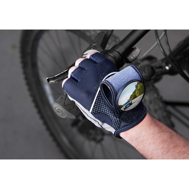 - Rearview Mirror Cycling Gloves by Sharper Image are the rugged fingerless bicycle gloves with a curved, wide-angle mirror on the back of the left glove. Secured with hook-and-loop fabric, the mirror adjusts from 30° to 90° to give you a view of approaching vehicles. There’s also a hidden accessory pocket to hold a key or cash. Adjustable straps, one size fits most adults. Includes left glove (with mirror) and right glove (no mirror).