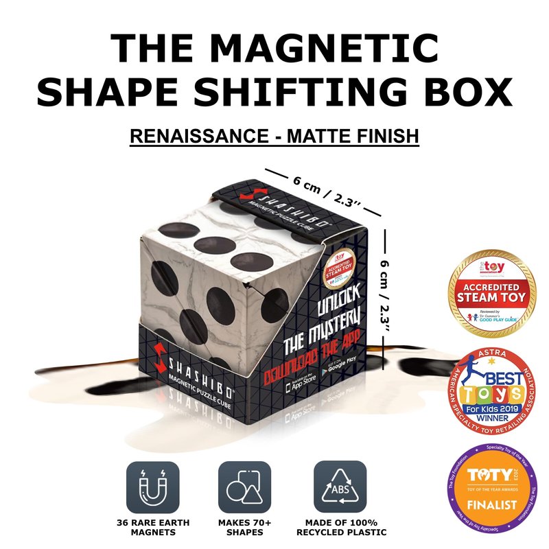 - Unlike other puzzle box toys that turn out disappointing & dull, the patented, award-winning shashibo sensory box features 36 rare earth magnets for an innovative design that transforms into over 70 shapes. Fits comfortably in the hand for hours of mind-challenging fun, stimulate the senses with unlimited creative possibility! Can you master the shape-shifting box?