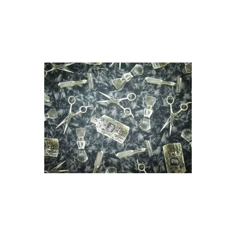 - Item Specifics: Material :cotton Lic Cotton Print Width: 44 Amount: Half Yard , This is for one Half Yard measuring 18 x 44 inches of this neat print of Men's Saving Items - including scissors, a brush, talc and more on a Black Background! This is a fun and unusual fabric