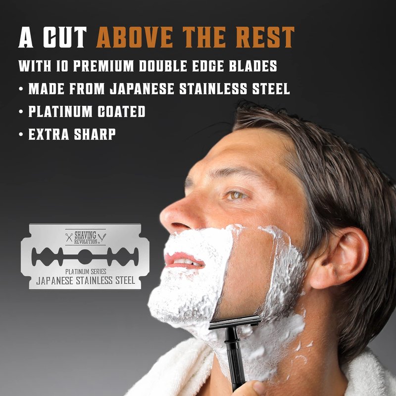 SHAVING REVOLUTION Long Handle Double Edge Safety Razor - Butterfly Open Razor 10 Japanese Stainless Steel Double Edge Blades - Close, Clean Shaving Razor Men., Black Long Handle, 12 Piece Set