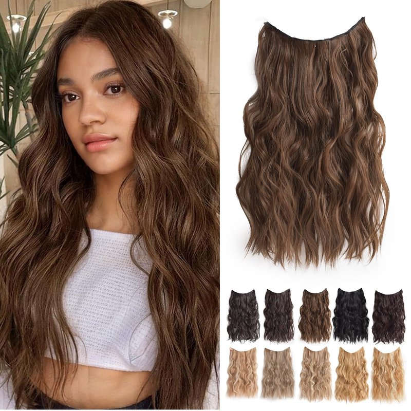 SHDanrtsey 21inch halo hair extension Adjustable Size 4 Secure Clips Invisible Wire Hair Extensions with Transparent Headband Wire hair Brown Long Wavy halo extensions(8M10#)