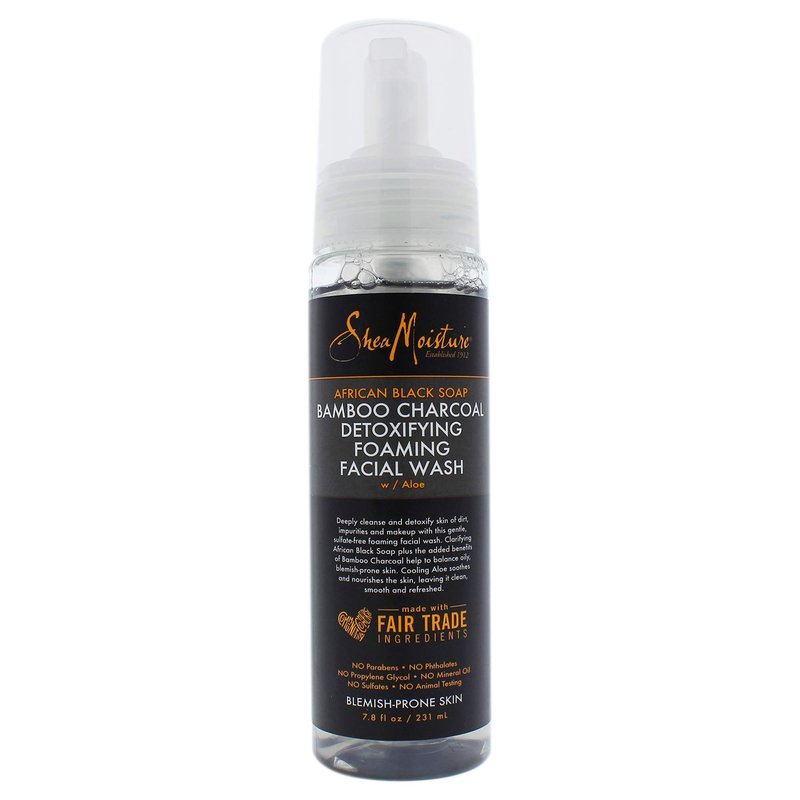 Deeply cleanse and detoxify skin of dirt, impurities and makeup with SheaMoistures gentle, sulfate-free African Black Soap and Bamboo Charcoal Detoxifying Foaming Facial Wash.