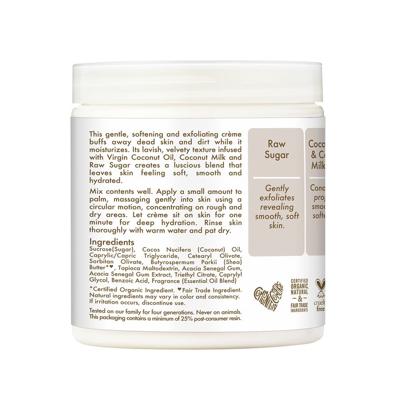 - VIRGIN COCONUT OIL + COCONUT MILK: The gluten free coconut oil, coconut milk, and raw sugar used in this Daily Hydration Crème Sugar Scrub leaves skin soft, smooth, and hydrated.