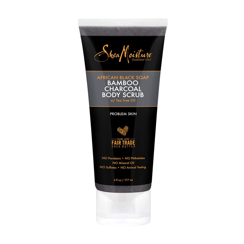 - This body scrub buffs away dead skin cells while also helping to absorb excess oil and impurities; African Black Soap blended with bamboo charcoal helps balance and draw out dirt from problem skin while organic raw Shea butter helps moisturize and soothe