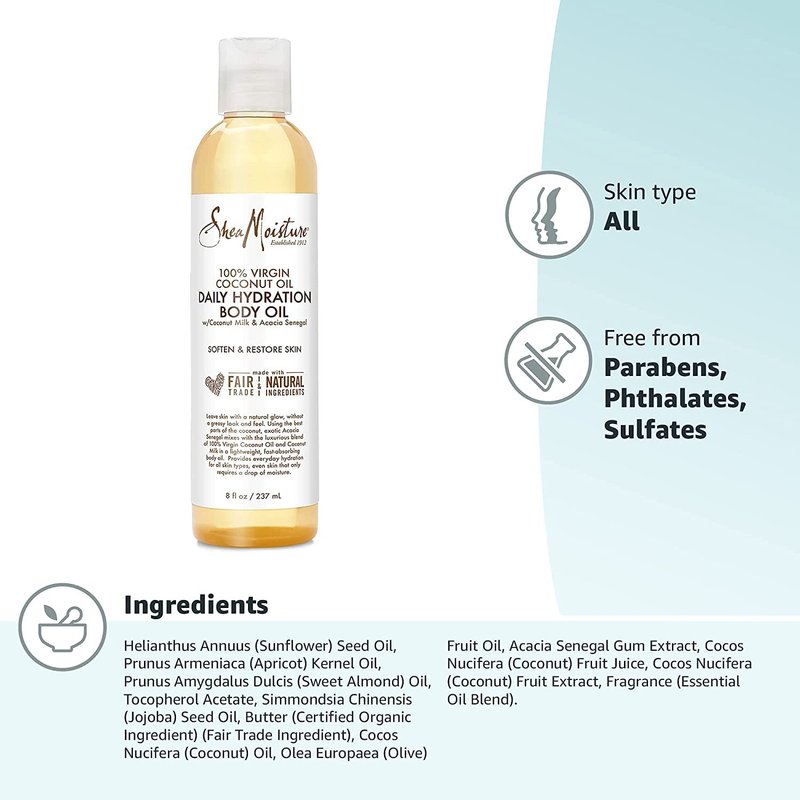 - COCONUT OIL TO REDUCE DRYNESS: The coconut oil used in Shea Moisture Daily Hydration Body Oil is rich in vitamins to reduce dryness and leaves skin feeling soft and pampered.