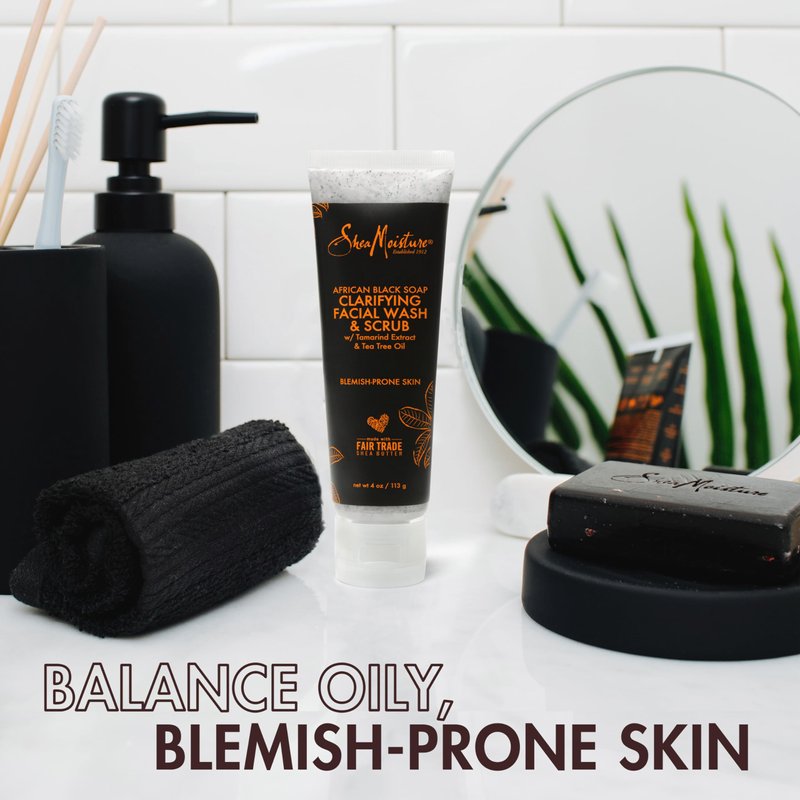 - SheaMoisture Clarifying Facial Wash & Scrub is a facial cleanser, facial scrub and exfoliator made to help blemish prone skin transform into glowing skin.