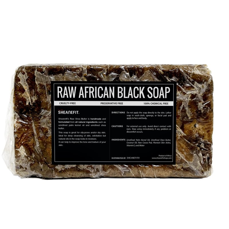Sheanefit Raw African Black Soap Bar - For All Skin Types - Face, Body, Hair Soap Bulk Bars INGREDIENTS: Unrefined Palm Kernel Oil, Unrefined Shea Butter, Coconut Oil, Raw Cocoa Pod, Plantain Skin Ashes, Vitamin E, and Water