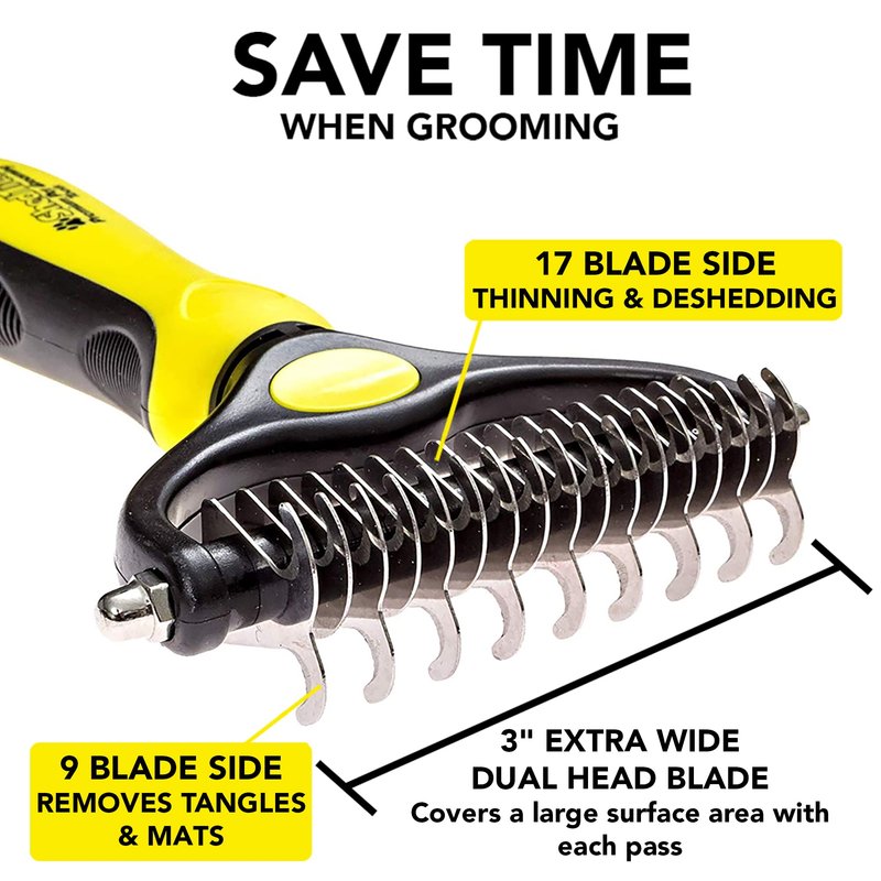 - UNDERCOAT RAKE WITH EXTRA WIDE DUAL HEAD BLADE - Wide blade covers large surface area to save you time when grooming. Start with the 9 blade side to remove tangles and mats and finish with the 17 blade side for thinning and deshedding.