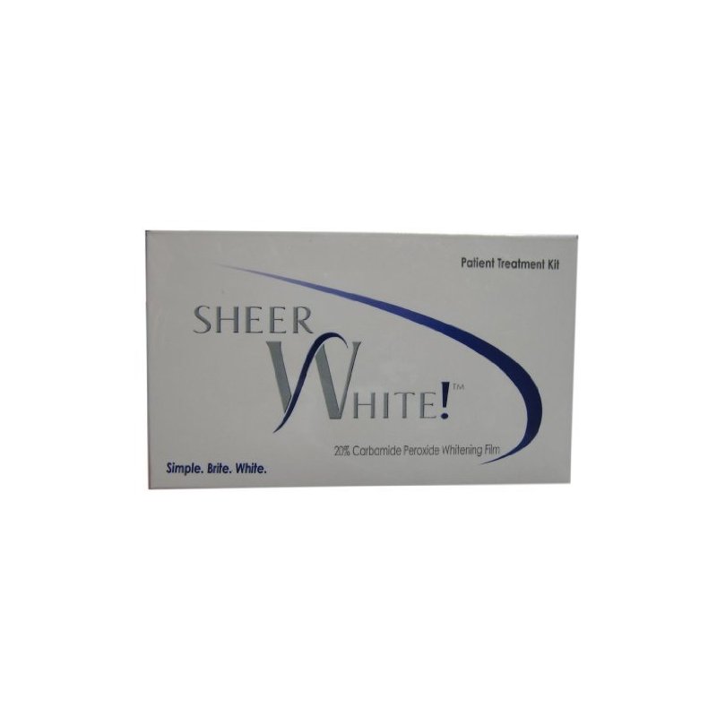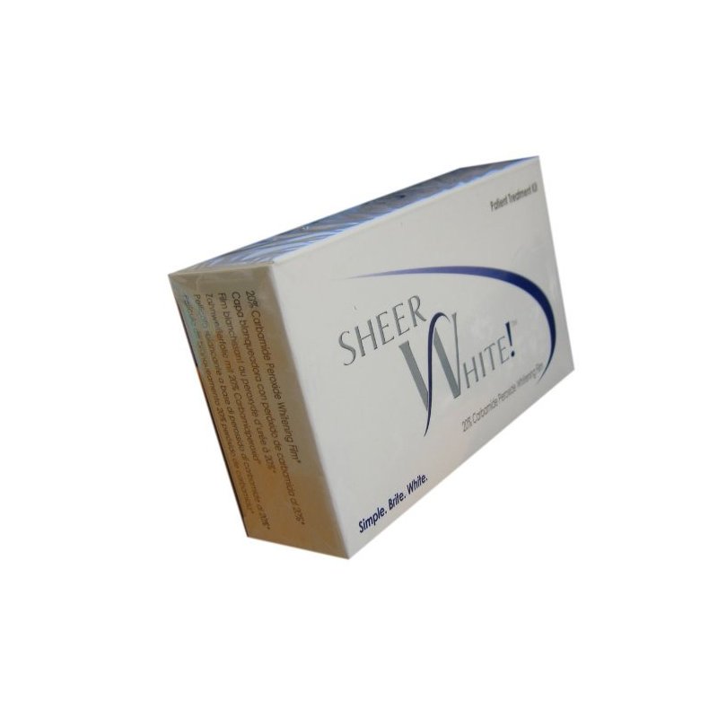 Sheer White! 20% Carbamide Peroxide Whitening Film teeth whitening films: goes on easy; stays where you put it; whiten fast. Sheer White! is the most significant advance in teeth whitening in nearly a decade. The thin flexible moldable material closely adapts to every surface holding the whitening gel where it belongs – against the tooth surface. No leaking or wash out of gel. No slipping or sliding of the film. Comfortable, long–lasting wear. Even, effective whitening. Easier. Faster. Better.