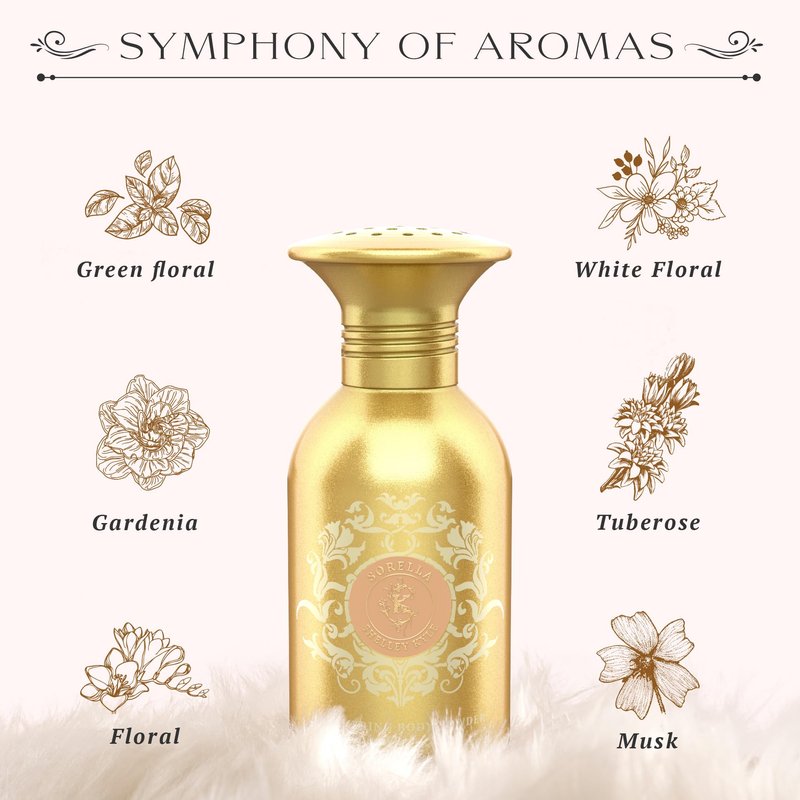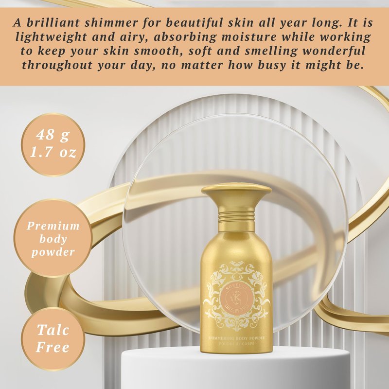 - A talcum-free shimmering body powder that softens and smooths skin while leaving behind a gentle and flowery fragrance