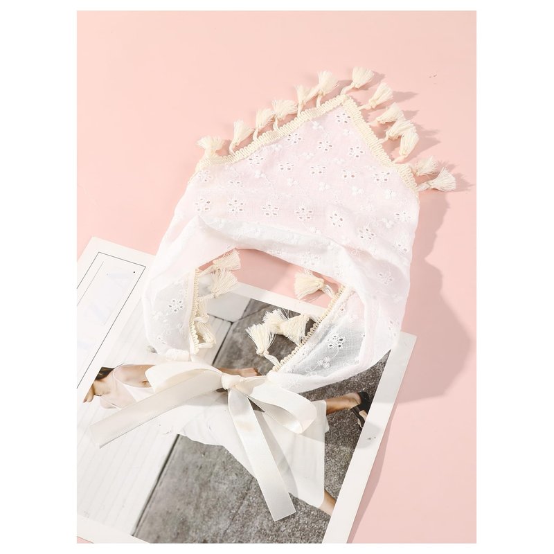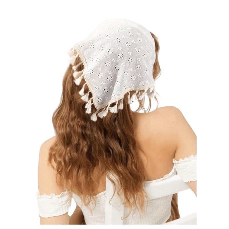 - Elevate your everyday look with this exquisite tassel bandana headband. The intricate eyelet embroidery adds a touch of sophistication and a bohemian flair, making it a versatile accessory for any occasion.