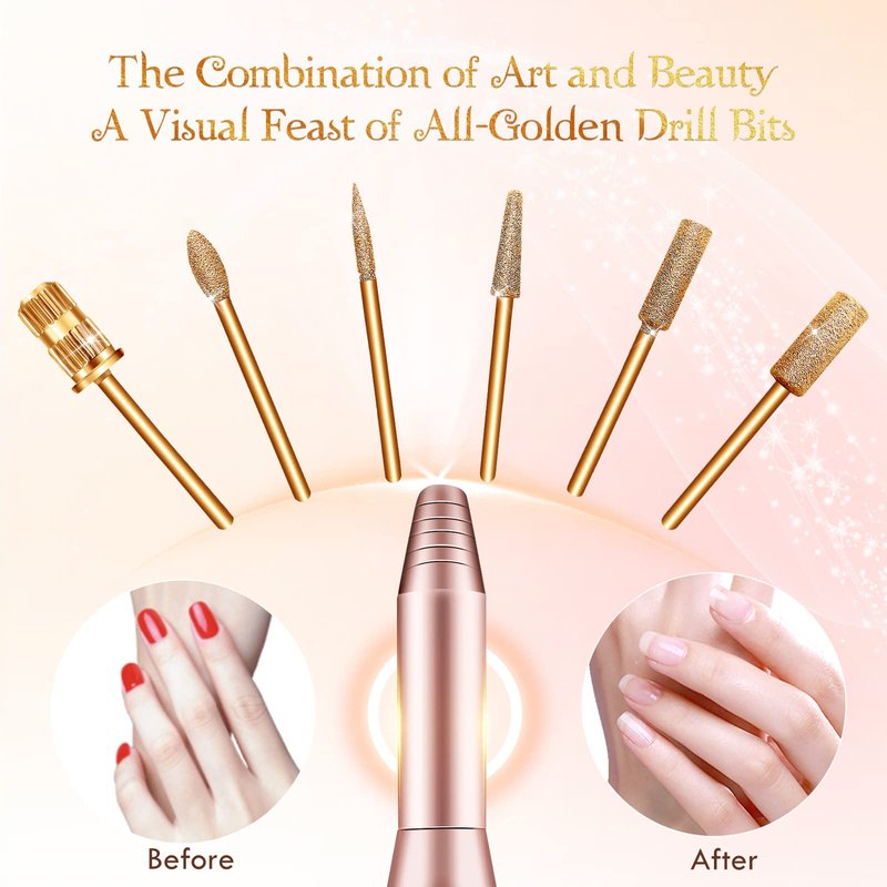 - 【High Quality & Aesthetic】The new compact and lightweight pen-shaped handle, which is ergonomic and more comfortable to hold, has been tested thousands of times. The stylish and streamlined electric nail file is made with high-tech process. At the same time, nail drill kit is equipped with 6 all-gold drill bits, a combination of art and beauty.