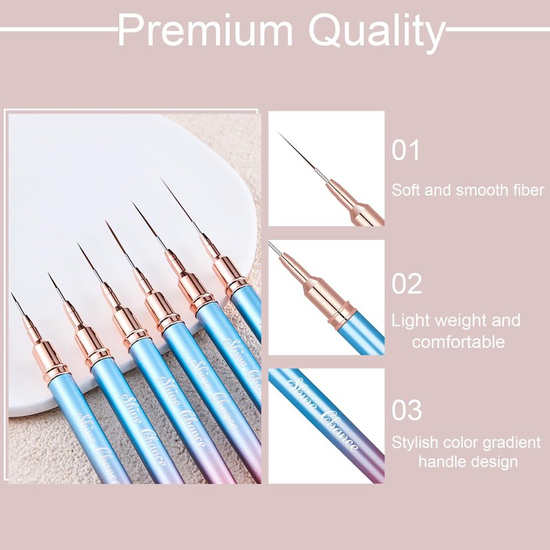 - 💗【Professional Nail Liner Brushes】: This art nail brushes comes with 6 pcs different size: 5mm, 9mm, 14mm, 17mm, 20mm and 25mm. Meets various of different nail art needs. Perfect for tiny details, delicate and exquisite patterns, fine lines of nail designs. It's super suitable for professional nail salons or beginners diy at home.
