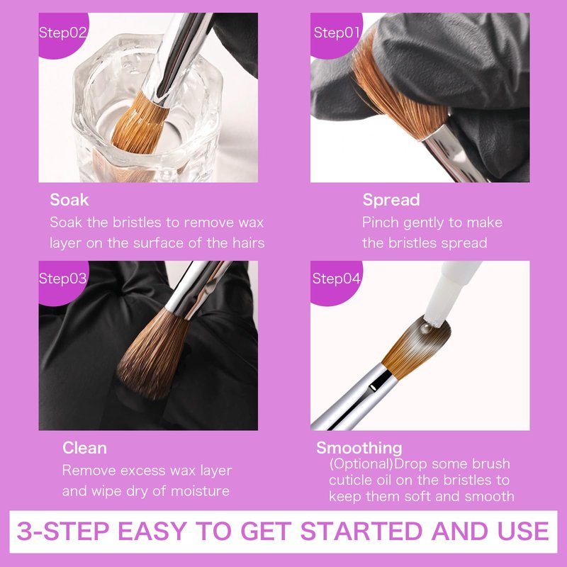 - 【Warm Tips】: Soak the acrylic nail brush in hot water (above 176 °F) for a minute to wash off the sealing wax on the surface in the first use. To lengthen the lifetime of these acrylic brushes, please clean the nail brush immediately after each use to prevent hardening. Wait it dry, cap the cap on to protect the nail brush bristles.
