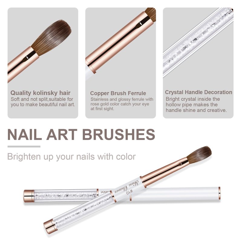 - 💠【Superior Quality】: Shine Chance Size 10 acrylic nail brush made of 100% pure kolinsky hair, high quality steel handle and brass ferrule holds the brush firmly, durable for long-term use. With good flexibility and unsurpassed acrylic powder-carrying performance, perfect for acrylic application. Comes in a plastic tube, convenient for storage and take out for a trip.