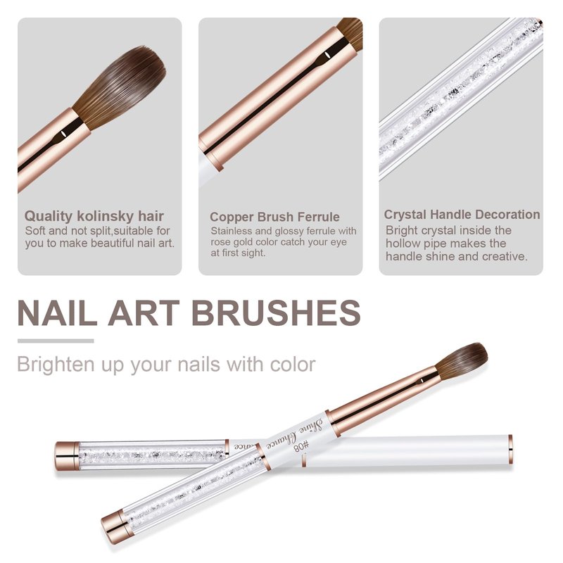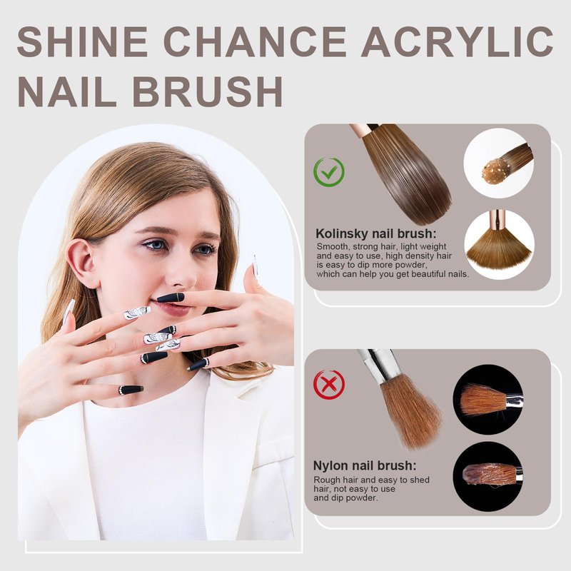 - 💠【Superior Quality】: Shine Chance Size 8 acrylic nail brush made of 100% pure kolinsky hair, high quality steel handle and brass ferrule holds the brush firmly, durable for long-term use. With good flexibility and unsurpassed acrylic powder-carrying performance, perfect for acrylic application. Comes in a plastic tube, convenient for storage and take out for a trip.