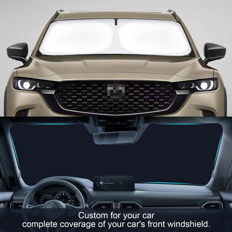 - šćEffective Interior ProtectionćThe windshield cover sun shade for cx-5 adopts a double-layer design, the silver layer in the car sun shade reflects sunlight falling on the windshield, and the black layer reduces the hot temperature inside the cabin. The car windshield sun shade protects the interior of the car and prevents the leather seats from cracking and fading.