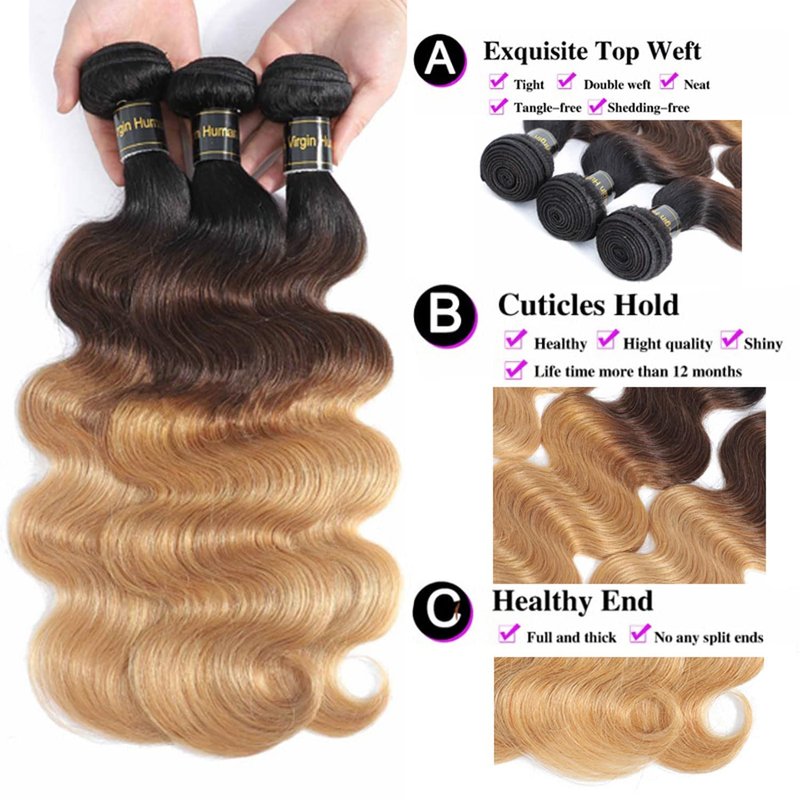 - Hair Color and Hair Weight: 1B#/4#/27# Ombre Color, Black/Brown/Blonde Three Tone Color. Can be colored, dyed, If You are not Professional, I Suggest You Go to the Salon; Bundle(95-100gram/pc,3 bundles 285-300gram in total). 1pc 4"×4" Ombre Lace Closure(35-50gram)