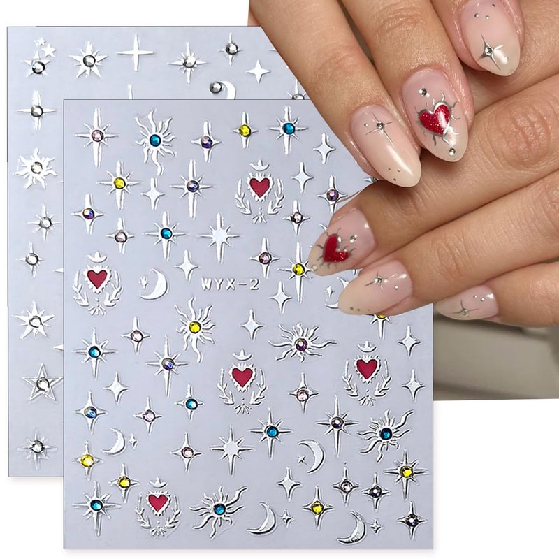 - 【Perfect Star Nail Sticker】You will get 4 sheets metallic star nail art stickers decals, Stars Moon Heart nail designs decoration, It provides you with a variety of options to give full play to your rich imagination of nail DIY.