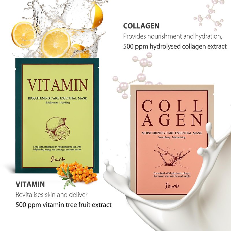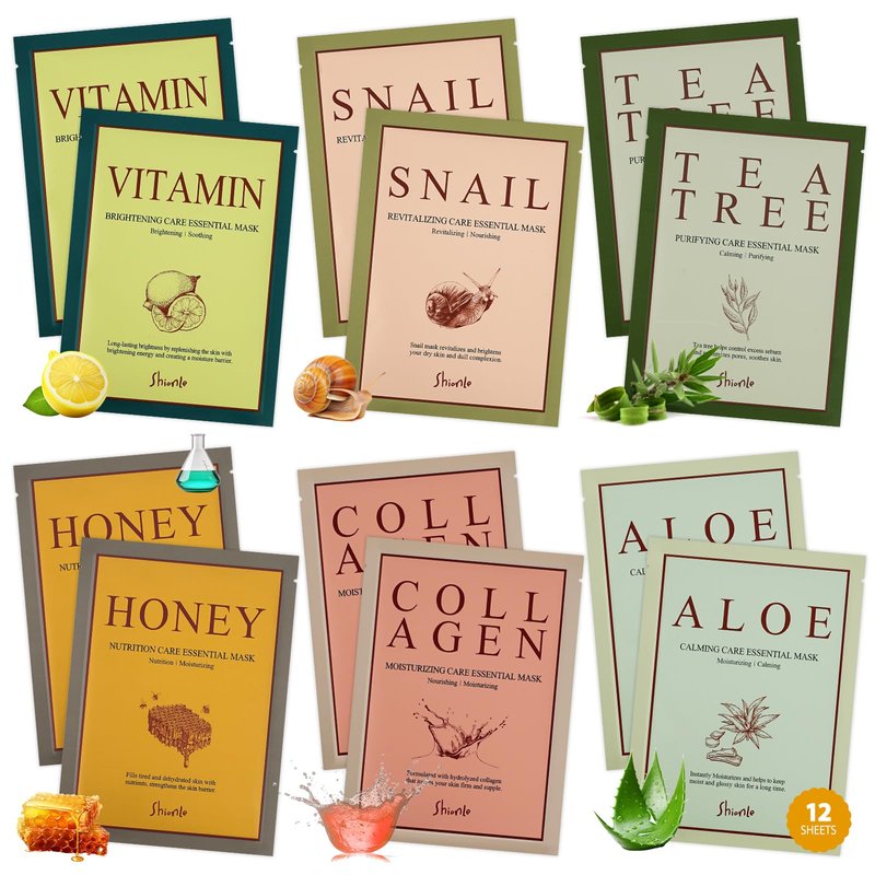 SHIONLE Daily Essential Face Mask Pack, 23ml X 12 Pack, 6 Types (Collagen, Honey, Vitamin, Aloe, Snail, Tea Tree) Korean Beauty Skin Care Set, Intense Hydration, Home Spa For All Skin Types