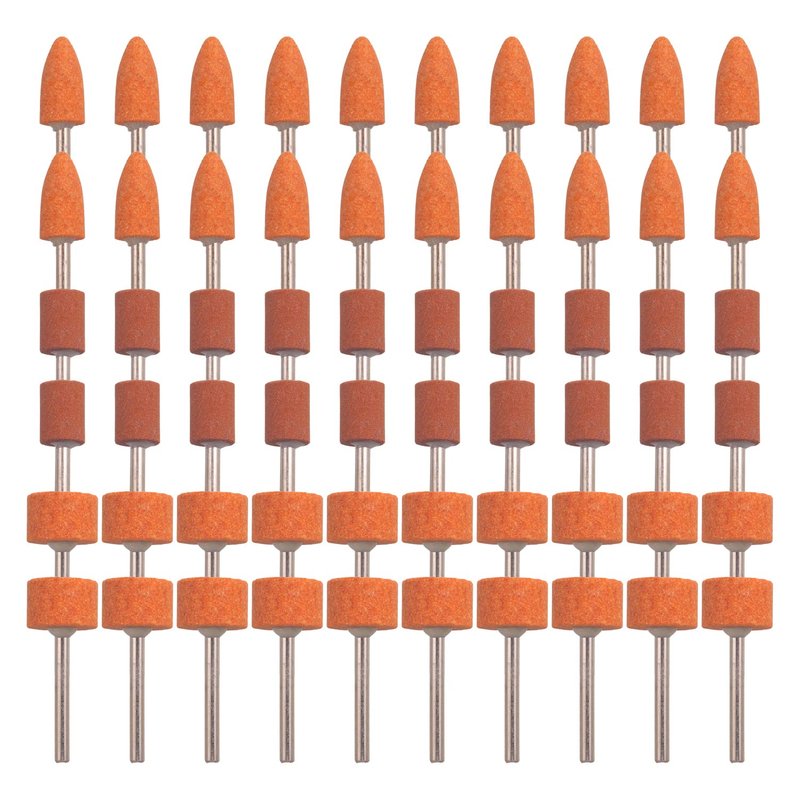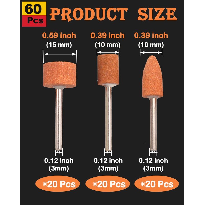 SHITIME 60 Pack Grinding Stone Set 1/8" Shank, Sanding Drill Bit for Rotary Tool Flap Wheel for Grinding, Polishing, Deburring Ferrous Metal, 2 Shaped and 3 Sizes(Orangage, Aluminum Oxide)