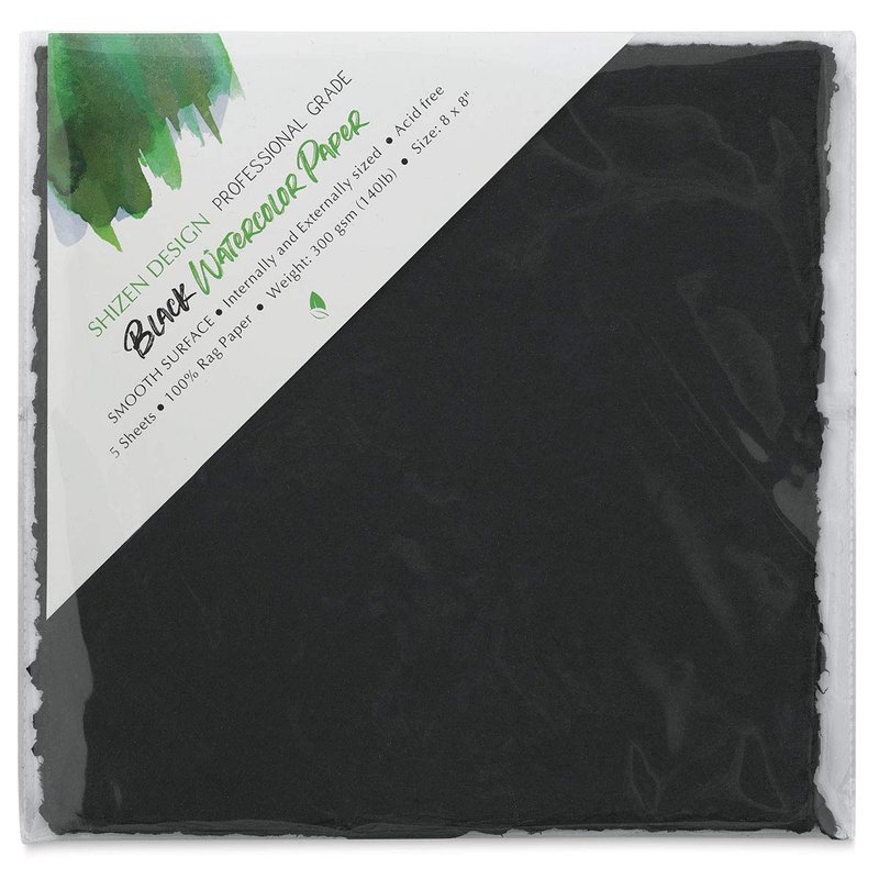 Shizen Design handmade watercolor paper from India in 140lb (300gsm) weight. It is 100% Rag, 100% Recycled, Acid-free, and internally & externally sized. This Hot Press, smooth texture paper has 4 beautiful deckle edges. It can be used for virtually any media including ink, pencil, pastel, marker, and water-based paint. Light colors and metallics work especially well. This is a pack of 5 sheets of black watercolor paper in 8x8 inch square size.