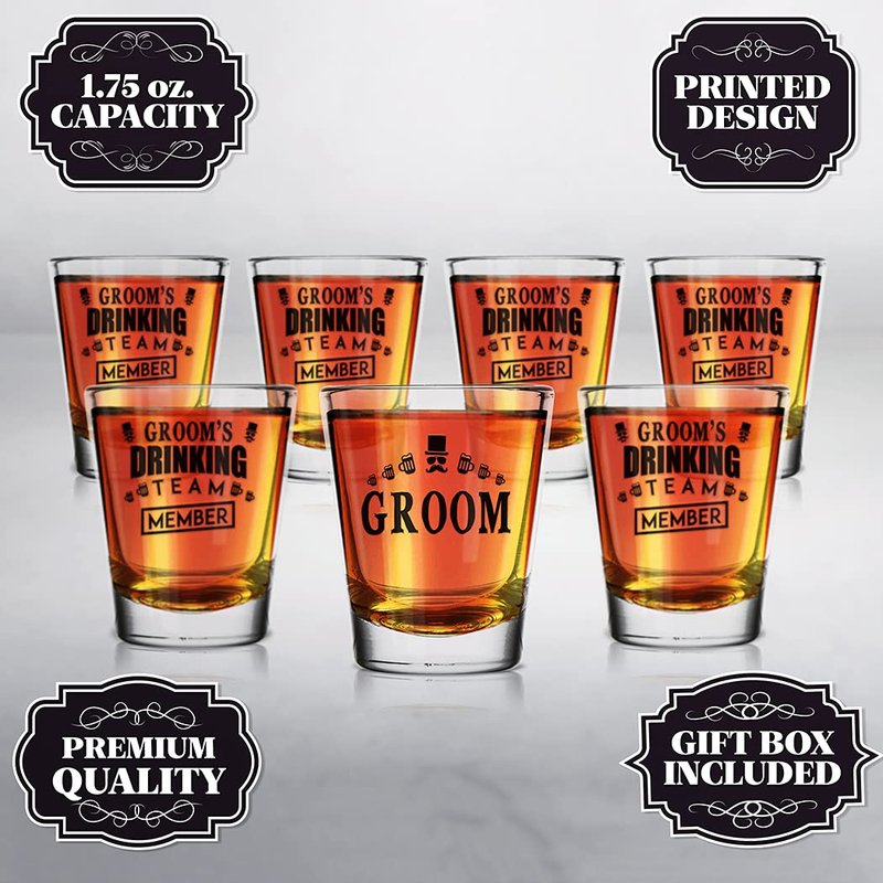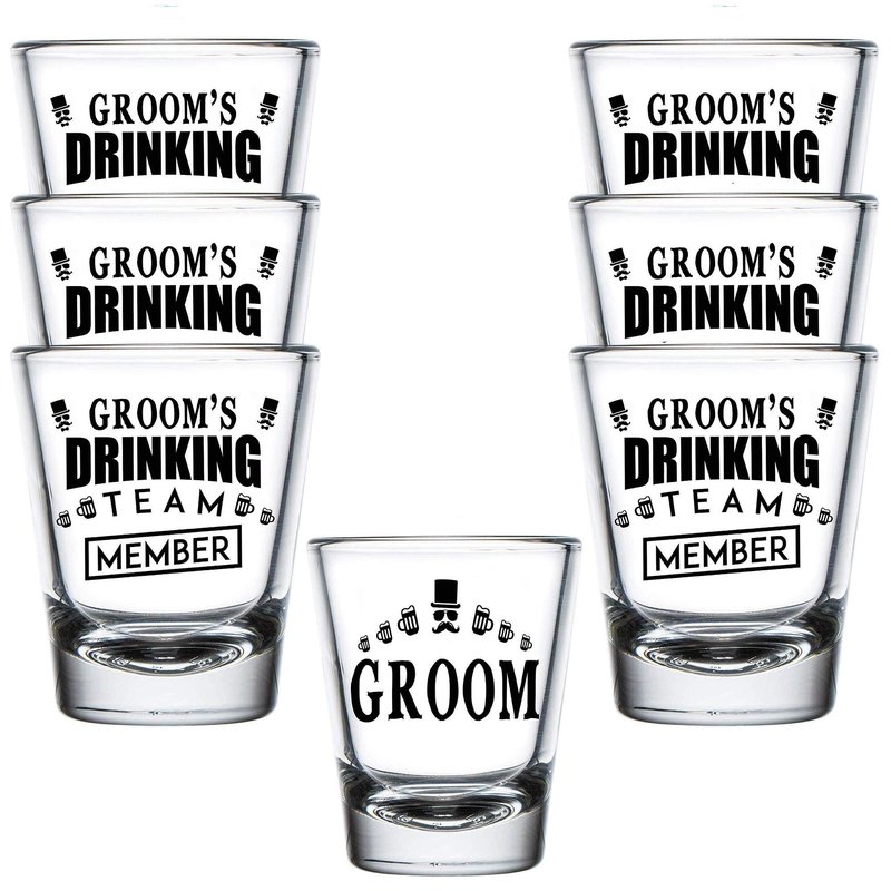 - CONTAINS: 1 Groom Shot Glass + 6 Groom's Drinking Team Member Shot Glasses.