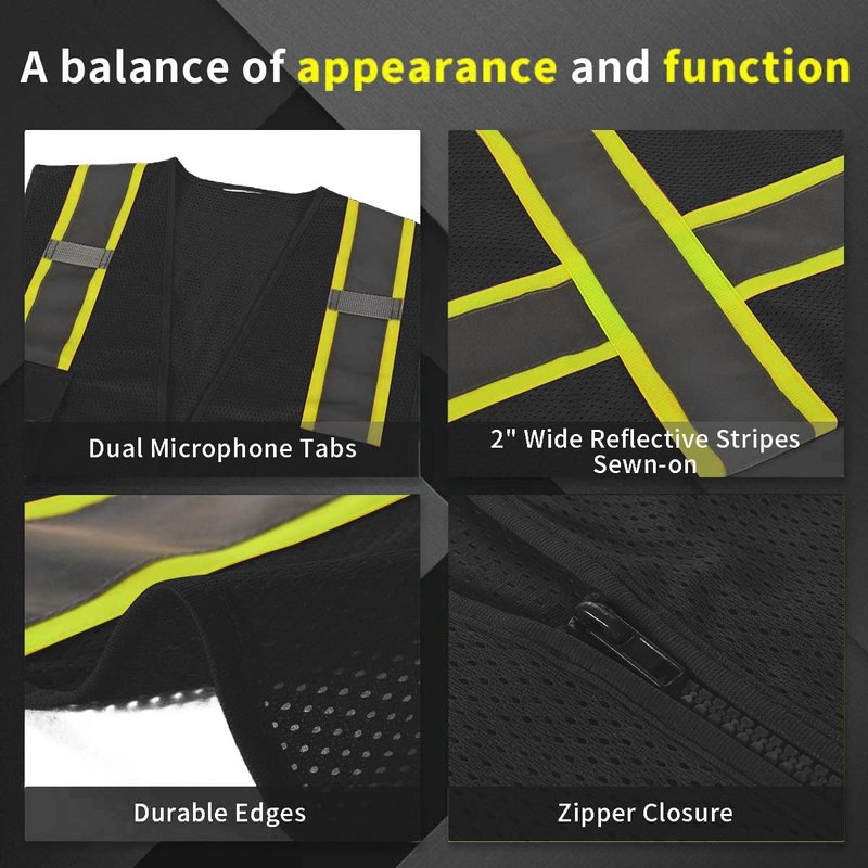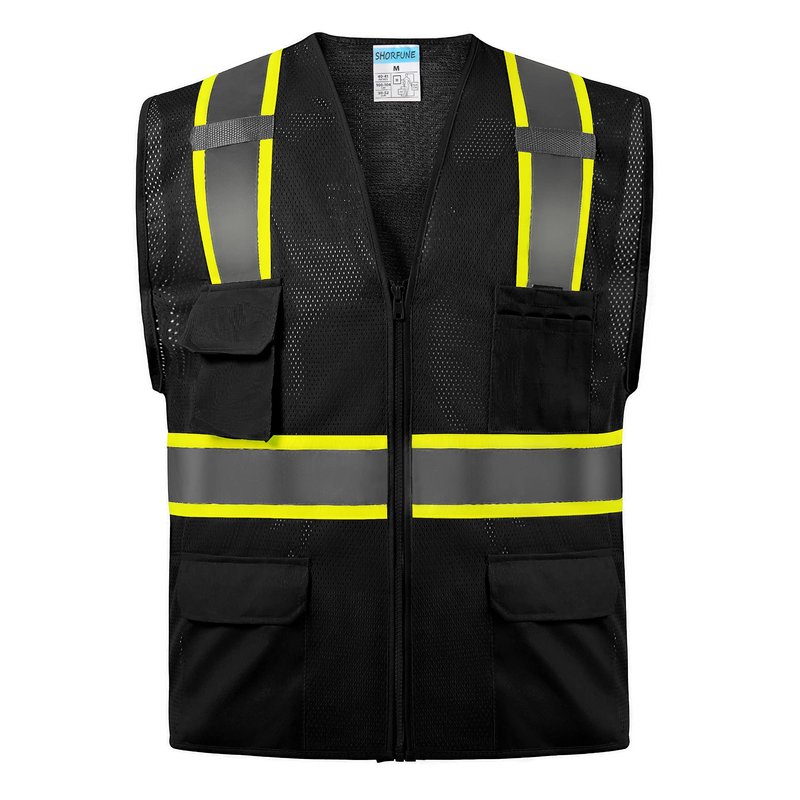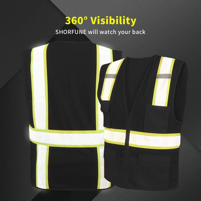 SHORFUNE High Visibility Safety Vest with 10 Pockets, Mic Tabs, Zipper and Reflective Strips, Reflective Construction Vest for Men and Women, ANSI/ISEA Standards, Black, XL