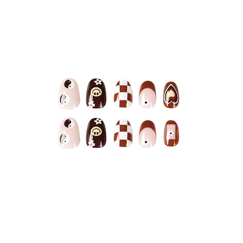 Short Almond Press on Nails Fall Brown Fake Nails French Tip False Nails with Hearts Flowers Brown Checkerboard Designs Cute Full Cover Round Head Acrylic Nails Glossy Autumn Glue on Nails for Women