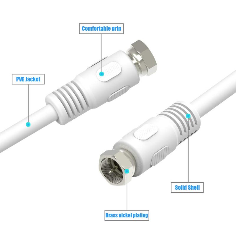 Over 95% coverage, the quad shield cable (aluminum foil and braid shielding) which is solderless, cold pressed and all-inclusive for assembly, can minimize crosstalk, suppress noise, and protect against electromagnetic interference (EMI) and radio frequency interference (RFI). 75 Ohm coax cable, really low loss and maximum protect the signal during the transmission.