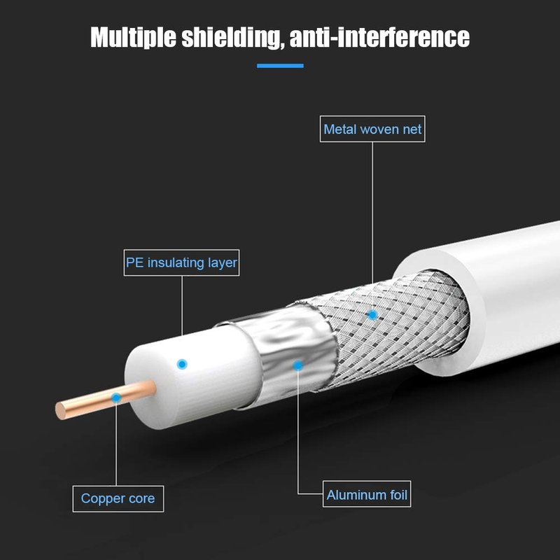 - Over 95% coverage, the quad shield cable (aluminum foil and braid shielding) which is solderless, cold pressed and all-inclusive for assembly, can minimize crosstalk, suppress noise, and protect against electromagnetic interference (EMI) and radio frequency interference (RFI). 75 Ohm coax cable, really low loss and maximum protect the signal during the transmission.