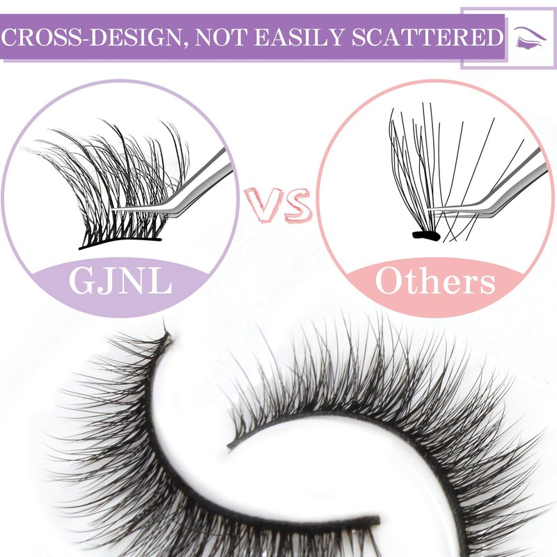 - High-Quality Fake Eyelashes: GJNL faux eyelashes are made of imported materials, super soft, and lightweight, lashes mink look real, not plasticky, and have gorgeous results, latest cross Design makes lash clusters that do not easily fall apart. High-quality synthetic lashes blend with and look like your own lashes with full bouncy volume & curl. Soft, lightweight, vegan, knot-free, and matte dark.