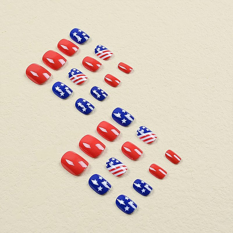 Short Press on Nails 4th of July Fake Nails with American Flag Designs Acrylic False Nails Square Red French Tip Nails Cute Stick on Nails for Women