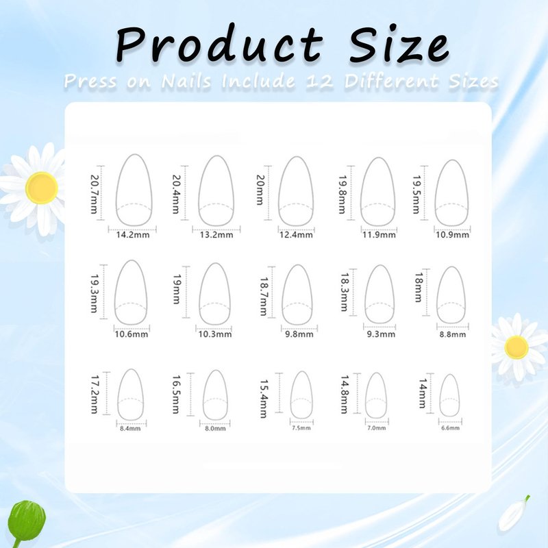 - MAOTTIE almond fake nails contains 24 pieces full cover nails with 12 different sizes, 1*jelly glue stickers, 1*mini nail File, 1*wooden Stick, 1*cleaning pad. Polish and file to any shape and length you like.