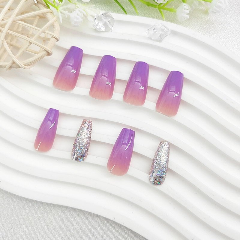 Short Press on Nails Coffin False Nails with Glitter Sequins Designs Purple Gradient Glue on Nails Short Nails Press ons Glossy Acrylic Nails Full Cover Stick on Nails for Women 24Pcs