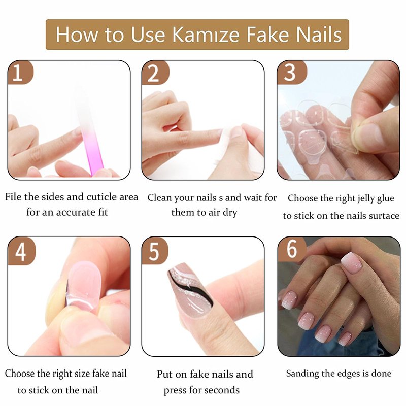 - You can use the nail stickers we give you (use the nail stickers, and the false nails can be reused). However, nail glue strips are not as effective as liquid nail glue. If you want the glue on your nails to last longer, you can use liquid nail glue, which lasts for 1-2 weeks.