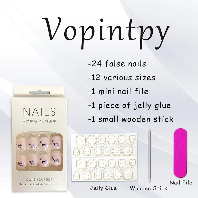 - 【Package & DIY Nails】You'll get 24 false nails in 12 sizes. 1 mini nail file, 1 small wooden stick, 1 piece of adhesive tab glue. You can safely choose a fake nail that fits your finger size and DIY your desired nail shape.