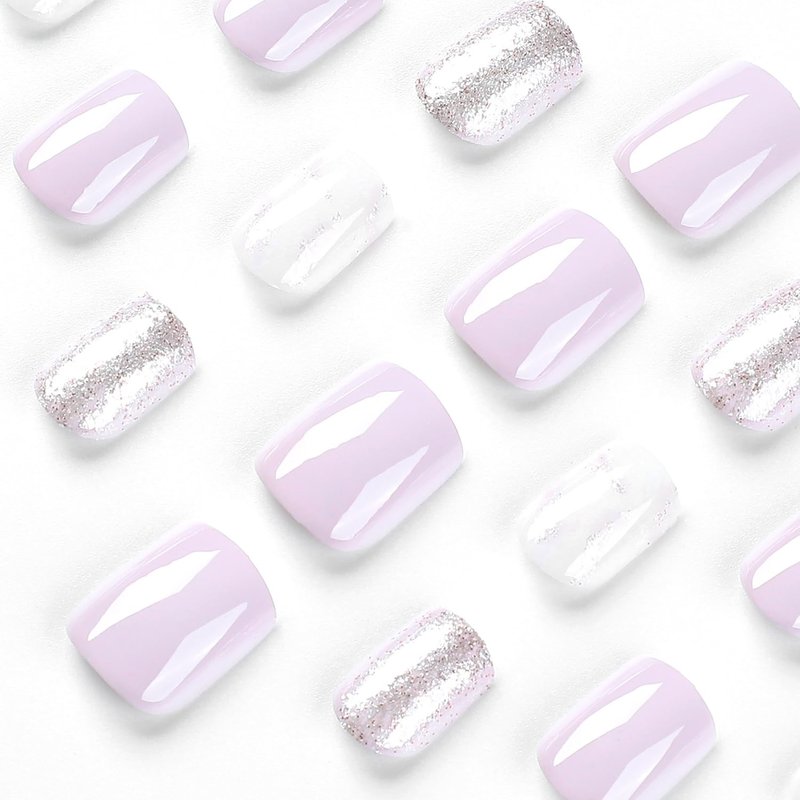 Short Square Press on Nails Pink Fake Nails Full Cover Sliver Glitter False Nails with White Pink Marble Designs Glossy Glue on Nails Petite Acrylic Nails Artificial Nails for Women Girls 24Pcs