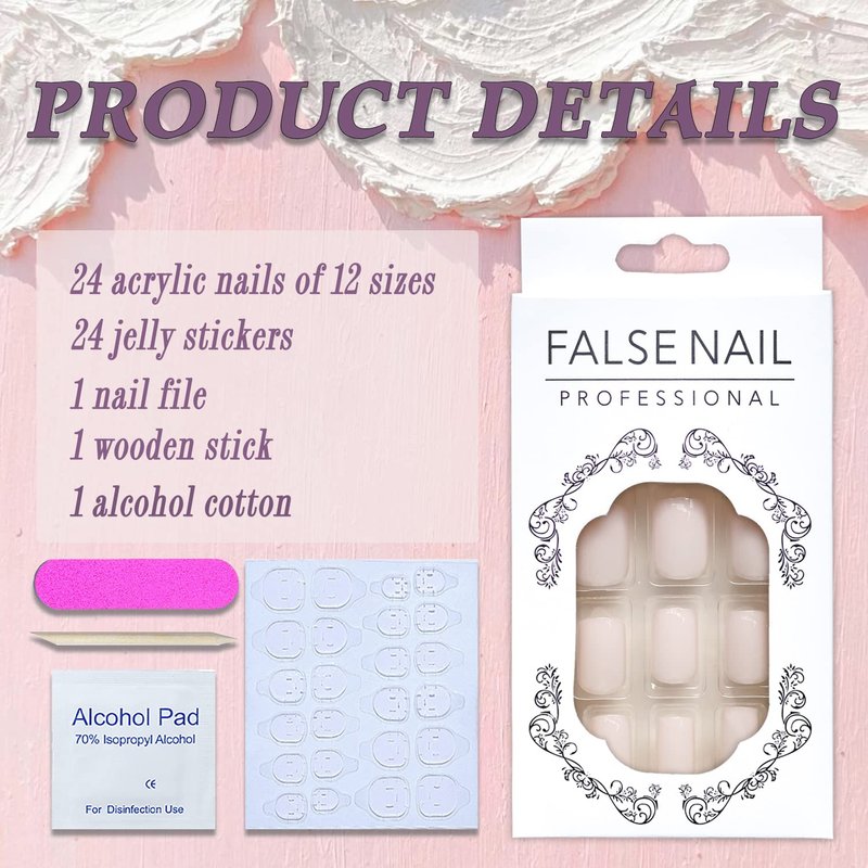 - 【Package Includes】 24 pieces short fake nails, 1 sheet of 24 pieces jelly glue, 1 piece of mini nail file, 1 piece of wooden stick and 1 piece alcohol pads.