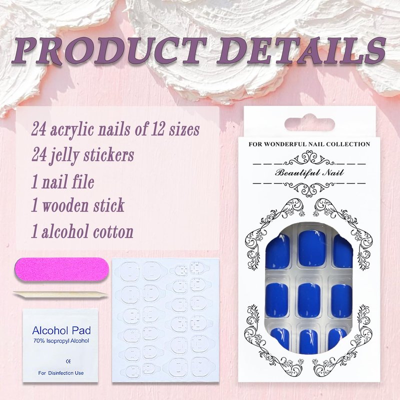 - 【Package Includes】 24 pieces square fake nails, 1 sheet of 24 pieces jelly glue, 1 piece of mini nail file, 1 piece of wooden stick and 1 piece alcohol pads.