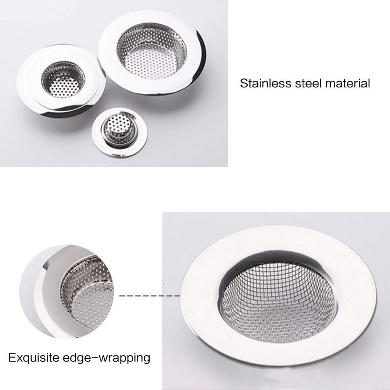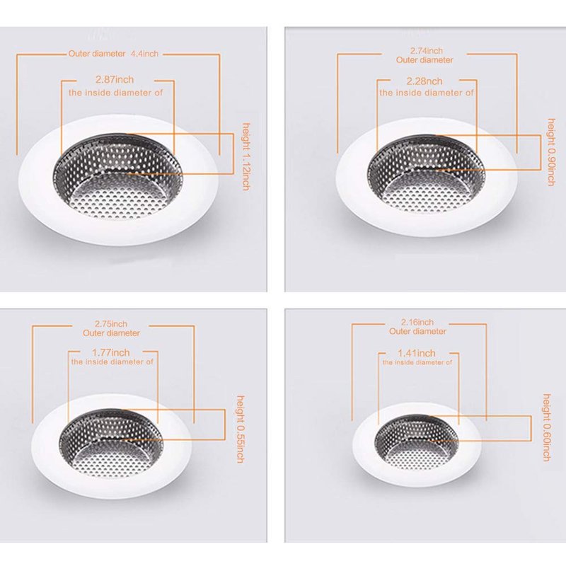 - 4 different sizes wrapped:Set of 4 (Large Medium Small Plus Small) Hair Catcher Shower Drain fits most sink drains and garbage disposals. Large: Outer diameter: 4.45”; inner filter: 2.87”; depth: 1.46”; Medium: Outer diameter: 3.54”; inner filter: 2.28”; depth: 1.18”; Small: Outer diameter: 2.76”; inner filter: 1.77”; depth: 0.98”; Plus Small: Outer diameter: 2.17”; inner filter: 1.42”; depth: 0.79”