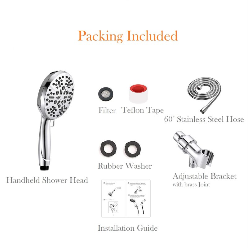 - @ Luxurious Hand Held Shower Head Set - The 5-functions 5" high pressure shower head good kit comes with 60 inch stainless steel extened hose, adjustable brass ball joint overhead bracket, anti-leak Teflon tape, rubber washers, and installation guide. You can easily install without any tooling in minutes, it fits any American Standard shower arm