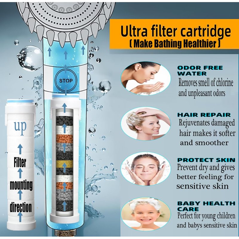 - ▶【ENHANCED SHOWER FILTER】:New filtered shower head includes an enhanced version of the filter , which filters twice more Heavy Metals, Chlorine, and Chloramine, Our filter shower head filters water to help with dry skin, rough hair and itchy skin. The shower head filter for hard water removes any unwanted substances from the water,To avoid purchasing the incorrect replacement filter cartridge, if you need to buy a replacement, Please go here to purchase ASIN: B0C7KHDP3X