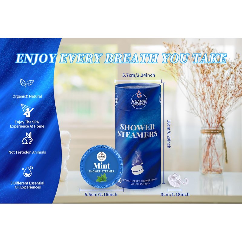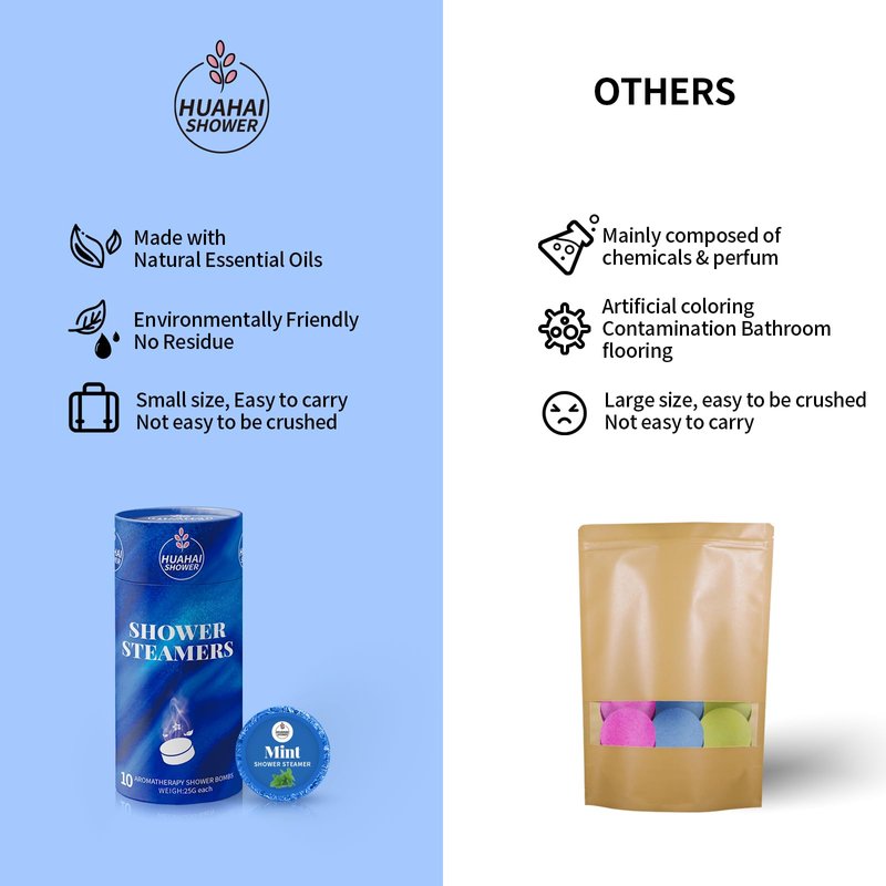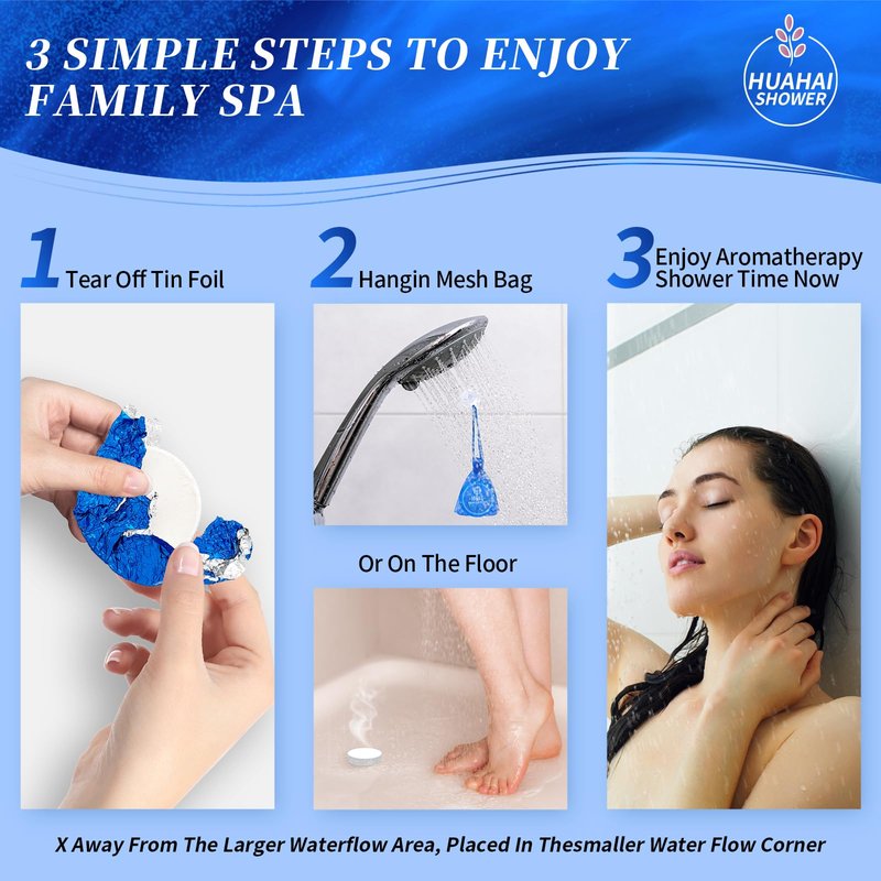 - 🌈[A New Experience] For a better experience, we have researched many shower steamers on the market. HUAHAI shower steamer is small in size, doesn't take up much space, not easy to be crushed, and it is easy to carry with you whether you are on a business trip or traveling!
