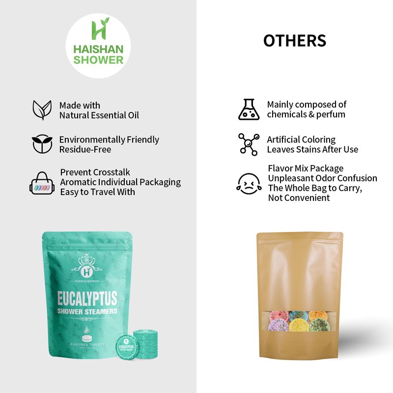 - [Eco-friendly and residue-free, easy to use] Take out a piece of shower steamers in aluminum foil and place it in the corner of the shower where the water flow is light, for best results, do not submerge the shower bombs, or put the shower bomb in a yarn bag and hang it up to rins. The intoxicating aroma takes you into a state of relaxation, HAISHAN shower steamers dissolve completely without residue and are non-slip, so they won't clog your home's drainage system