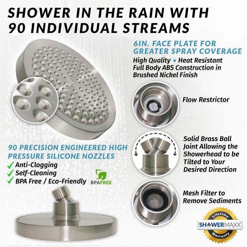 Luxury Rainfall Showerhead by ShowerMaxx Do you find yourself having to change position just so you can take a decent shower? Are you looking for a high pressure shower head that cleans you and not your wallet? Enhance the Quality of Your Shower and Experience an Indulgent Spa-Like Shower Starting Today! Introducing the Premium Rain Fall Shower Head by ShowerMaxx for Your Everyday Shower Needs. Made from ABS material with an elegant Brushed Nickle finish all around. Designed with 90 precision engineered high pressure silicon nozzles with the rain fall water pressure that is just right for you. The nozzles are self-cleaning silicon. With an adjustable brass ball joint and easy to remove flow restrictor. Each ShowerMaxx also comes with free Teflon plumber’s tape included to prevent leaks. Amazon Buyers Purchase ShowerMaxx Products With Total Confidence. You are backed by our Lifetime Warranty too! Product Sizing 6 x 6 inches What's in the Box? 1 X ShowerMaxx Shower head with flow restrictor and a filter disk installed 1 X BONUS Replacement filter disk 1 X Step-by-Step installation photo guide 1 X Teflon tape On Sale for a Limited Time. So be Sure to Click BUY Now!