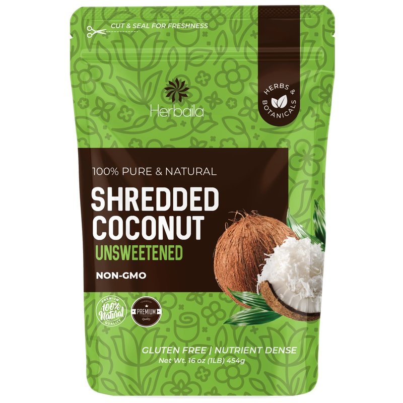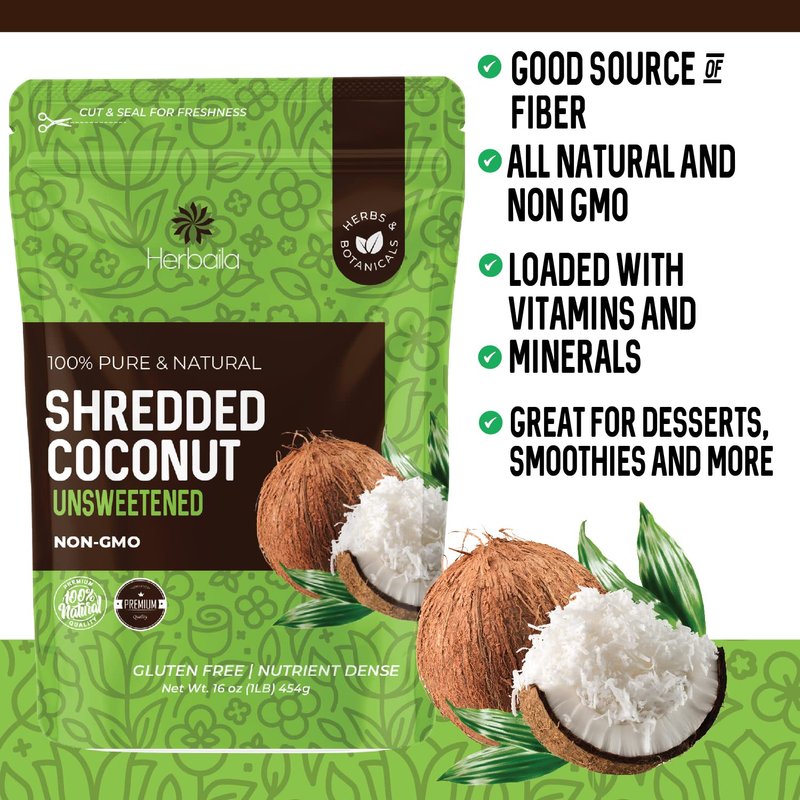 - There so many ways you can enjoy our lovely unsweetened shredded coconut. Add shredded coconut to your favorite salads, drinks, desserts and pastries. Bake a coconut cake or macaroons, or use as a fill for chocolate. Sprinkle on oatmeal, pudding, yoghurt and ice cream or add to trail mixes and granola bars.