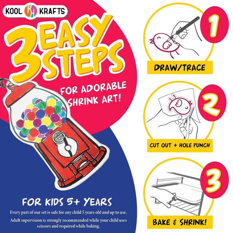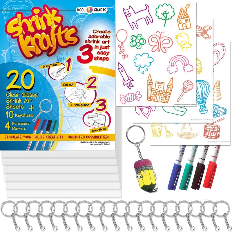 - CUTE, FUN, CREATIVE SHRINK ART: Create adorable charms and keychains for you and your friends with Kool Krafts! Our amazing shrink art set will provide you with the tools you need to craft uniquely designed shrinky bits to carry with you anywhere you go!