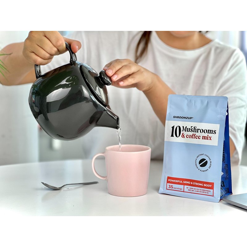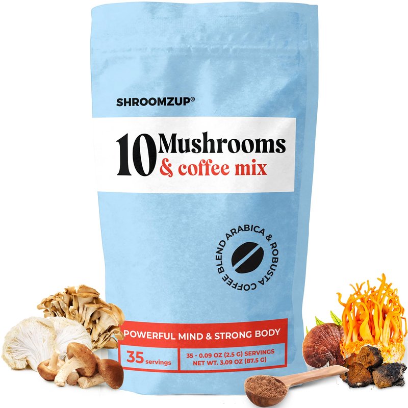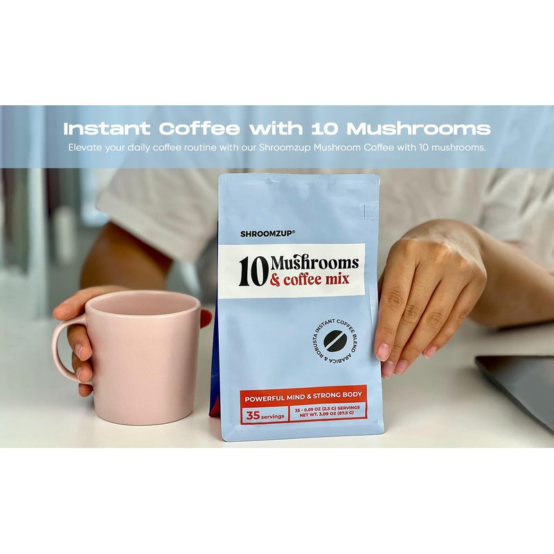 - 🍄 MUSHROOM COFFEE WITH 10 MUSHROOMS: Elevate your daily coffee routine with our Shroomzup Mushroom Coffee with 10 mushrooms. Experience the powerful combination of Reishi, Chaga, Turkey Tail, Cordyceps, Lion's Mane, Shiitake, Maitake, Tremella, Phellinus Ignarius, and Agaricus Blazei, carefully selected to elevate your mind and body. Each pouch bag has 35 servings.