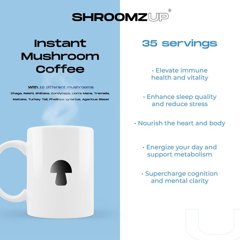 Shroomzup Mushroom Coffee Instant with 10 Mushrooms - 35 Servings with Reishi, Lion's Mane, Chaga, Turkey Tail, Cordyceps Mushrooms - Superfood Nootropic Coffee - Shrooms Instant Coffee Vegan for Energy